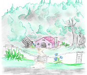 Ebben a pillanatban előbukkant a ködből egy kedves kis házikó. Gyönyörű, gondozott kertjében gyümölcsfák pompáztak, színes rózsabokrok közt egy keskeny, kövezett ösvény vezetett befelé.